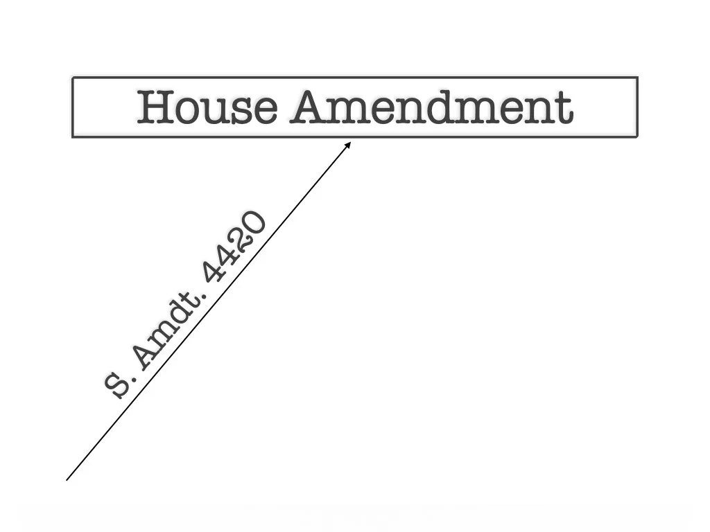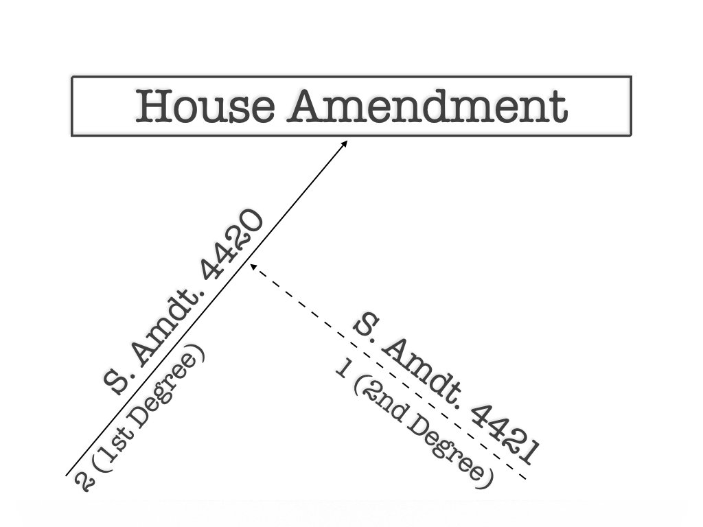 The Senate also uses a different amendment tree when considering amendments to a House message. Its precedents state, “when acting on an amendment of the House, that amendment is open to amendment in two degrees; that is, an amendment to the House amendment, and an amendment to the amendment to the House amendment.”