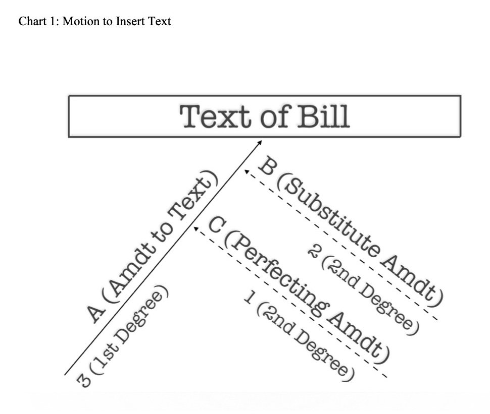 The majority leader usually prevents senators from offering amendments by filling the amendment tree. The amendment tree is a graphical depiction of the total number of amendments that can be pending simultaneously. (Note: Senate precedents refer to the amendment trees as charts.) The Senate uses different trees to depict senators’ amendment opportunities in various situations. Each tree facilitates the orderly consideration of senators’ amendments by adhering to general principles derived from English parliamentary law and first compiled for the Senate by Thomas Jefferson in his A Manual of Parliamentary Practice for the Use of the Senate. According to these principles, the Senate considers committee amendments before floor amendments. They also bar senators from amending legislative text that has already been amended. Given this prohibition, the principles state that senators have an opportunity to amend legislative text proposed to be stricken and/or inserted before the Senate votes on an amendment to strike/insert that text. They give motions to commit precedence over motions to amend. And they stipulate that first- and second-degree amendments are permitted, but third-degree amendments are not.