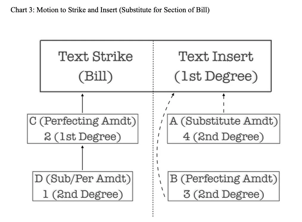 The Senate uses Chart 3 if the first amendment offered proposes to strike a section of the underlying bill and insert new text in lieu thereof (i.e., a substitute amendment).