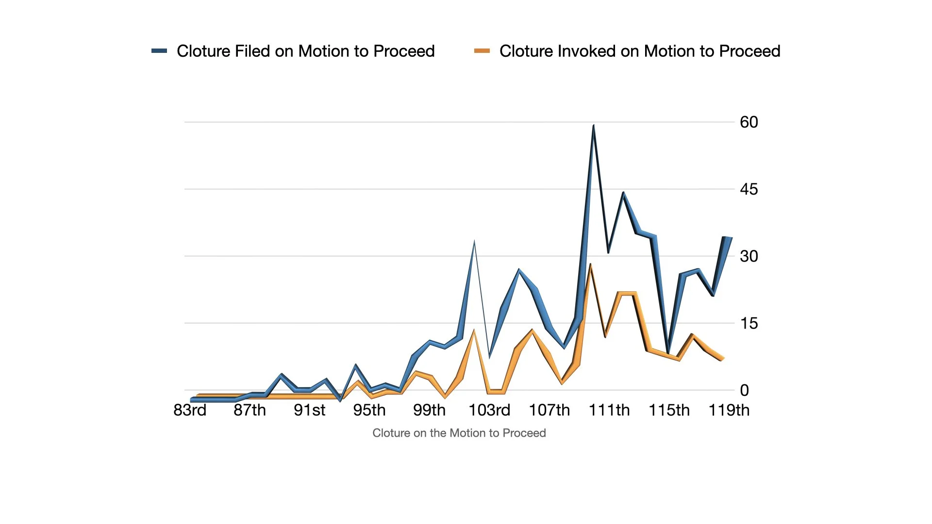 Democratic and Republican majorities alike have been frustrated with the Senate’s inability to begin floor debate on legislation. The majority typically files cloture on the motion to proceed to a bill when the Senate can’t begin debate by unanimous consent. The chart below shows the number of cloture filings on the motion to proceed in each Congress.